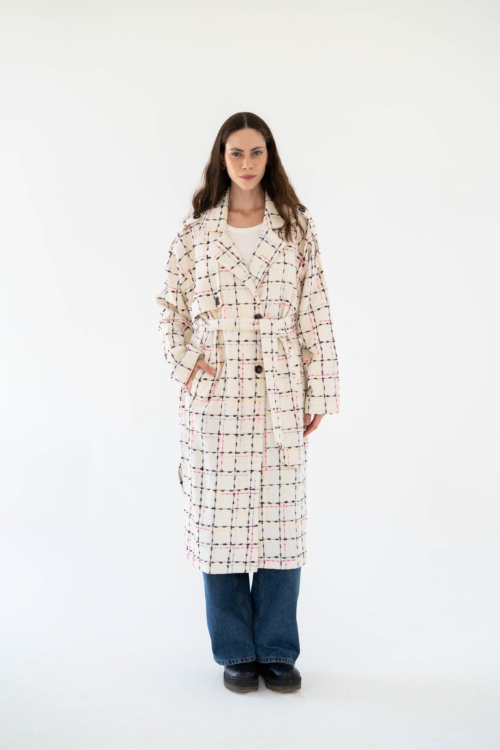 Crafted with a soft checkered pattern and a flattering belted silhouette, the Cozy Check Coat blends warmth and timeless style. A versatile piece made to elevate your everyday outfits with effortless elegance.