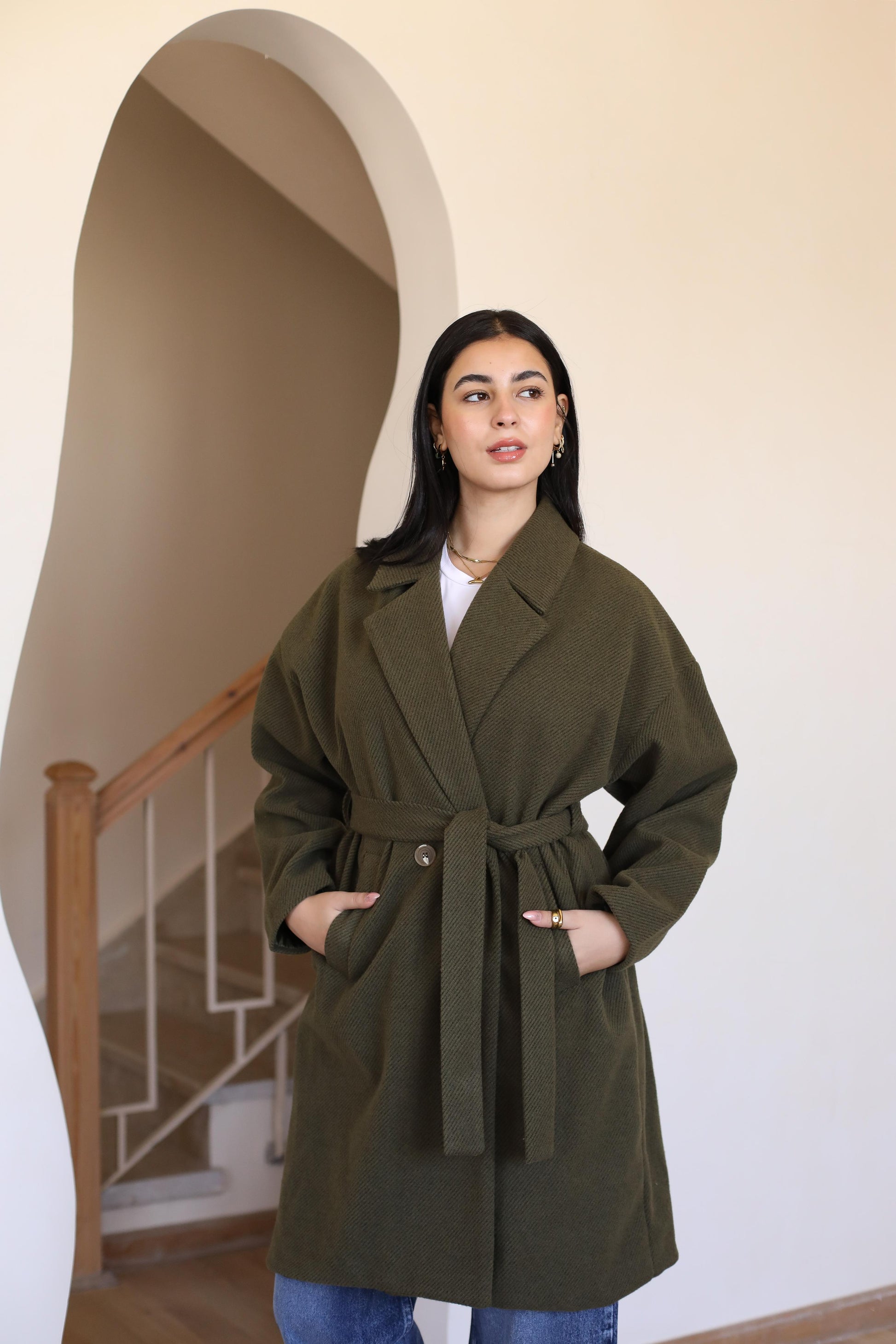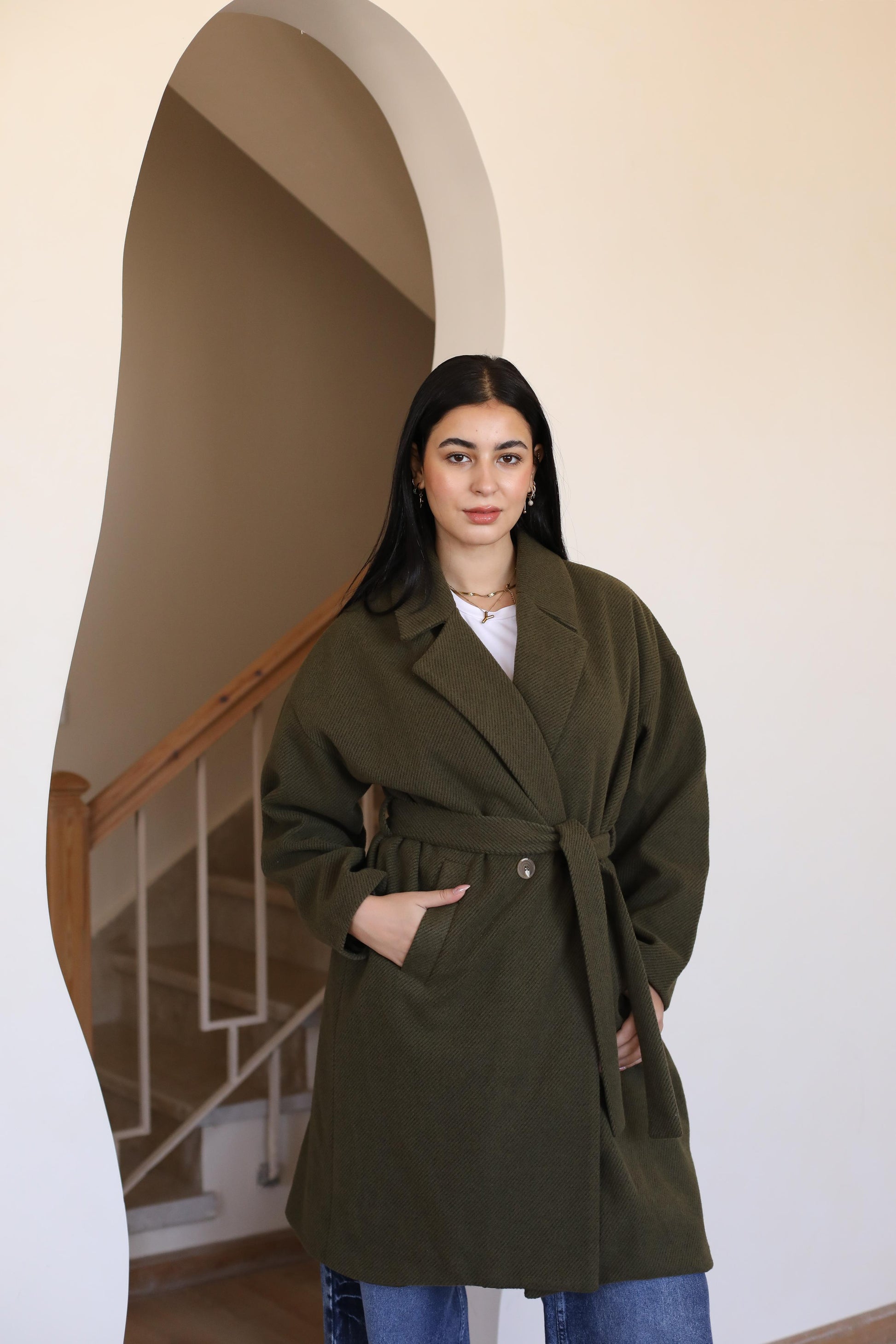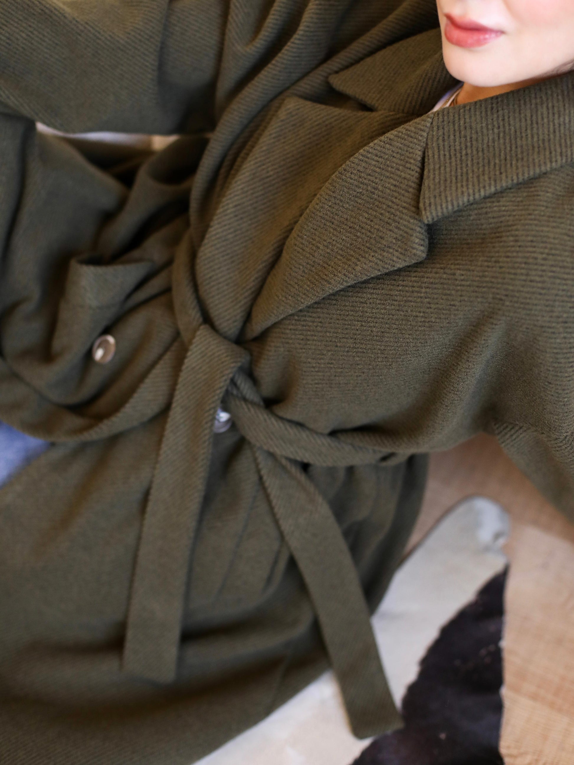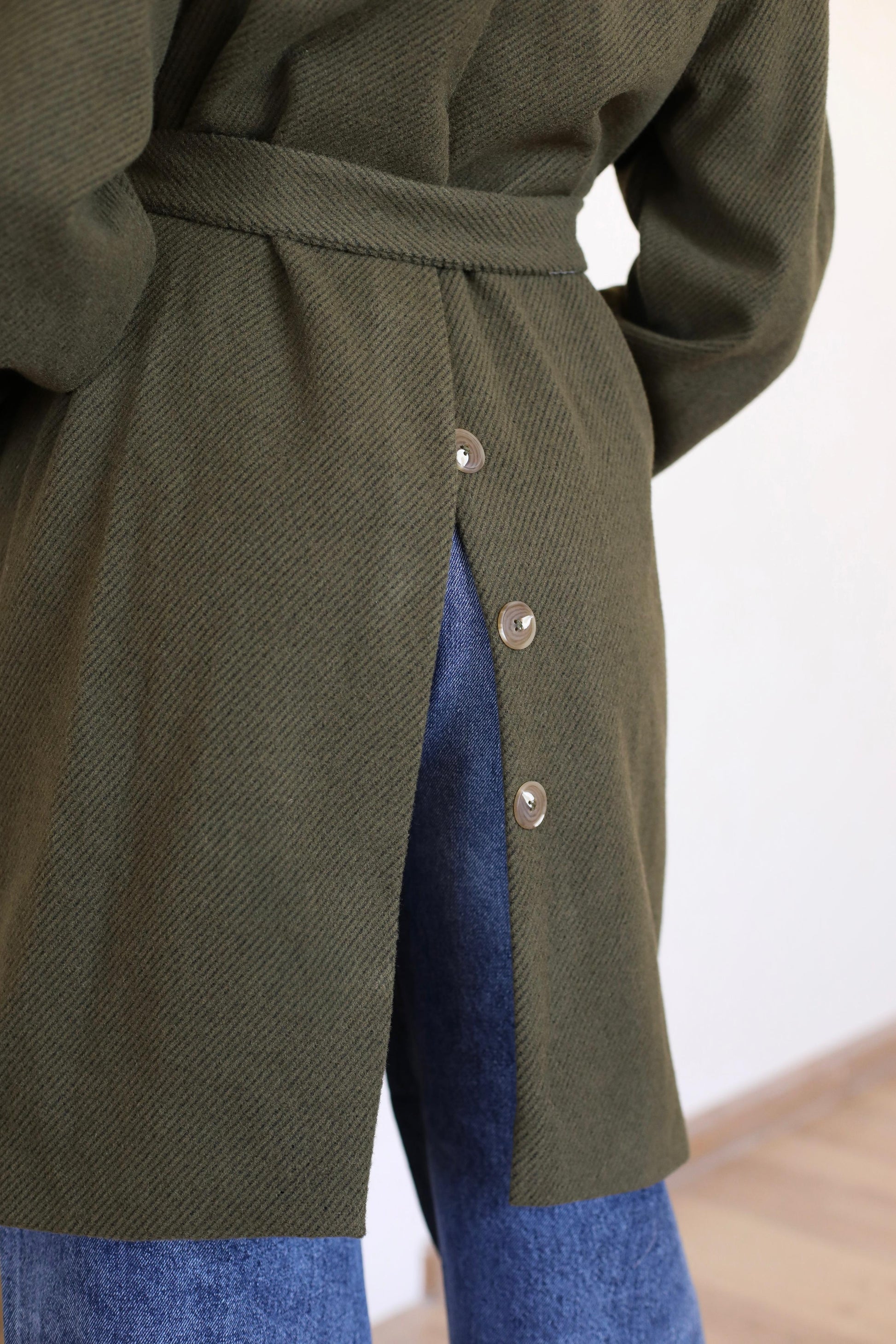 Long coat in woven fabric. Pointed lapels, bottoms at front, and welt side pockets. Wide, removable tie belt at waist, bottom at the back.