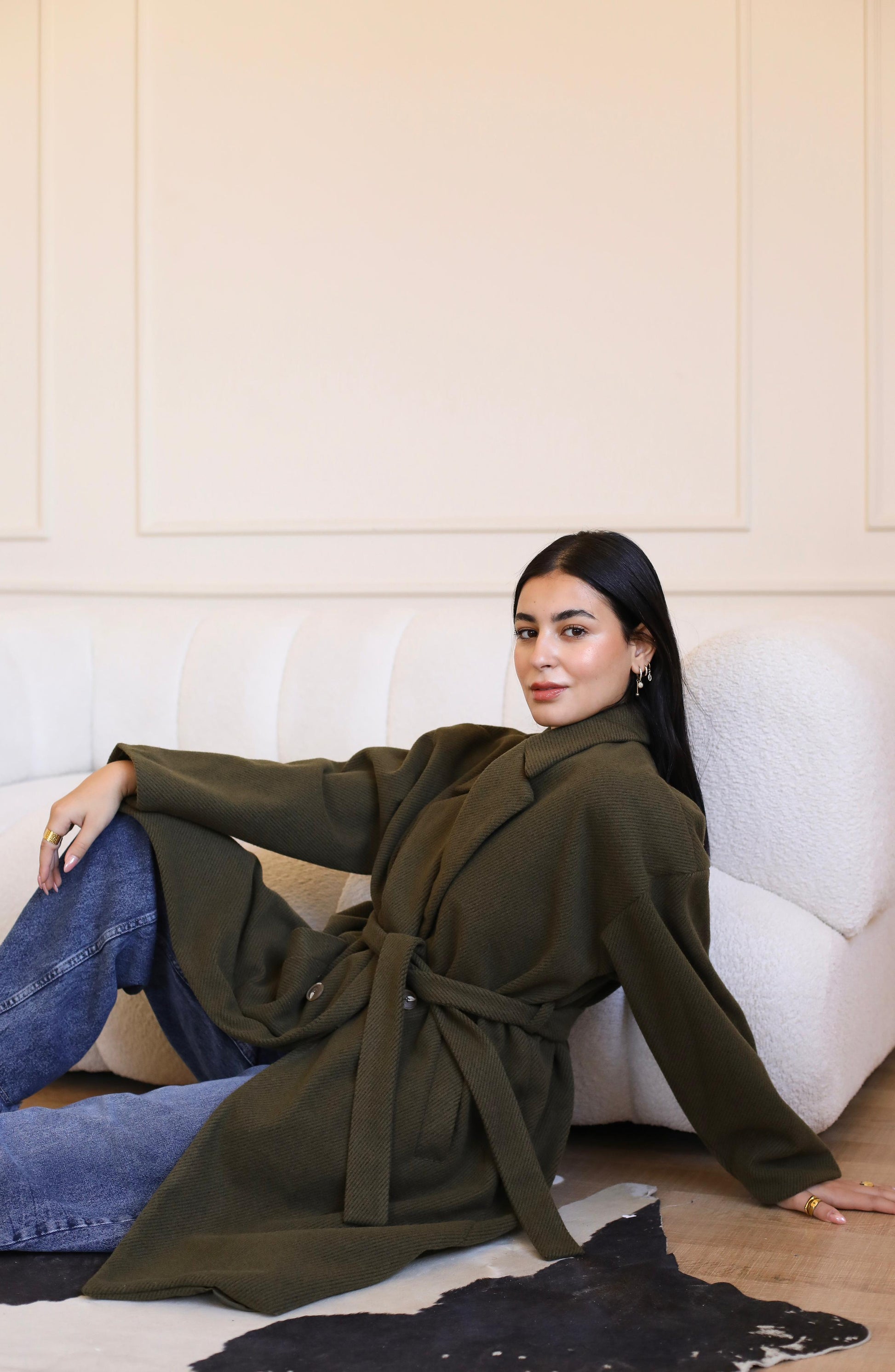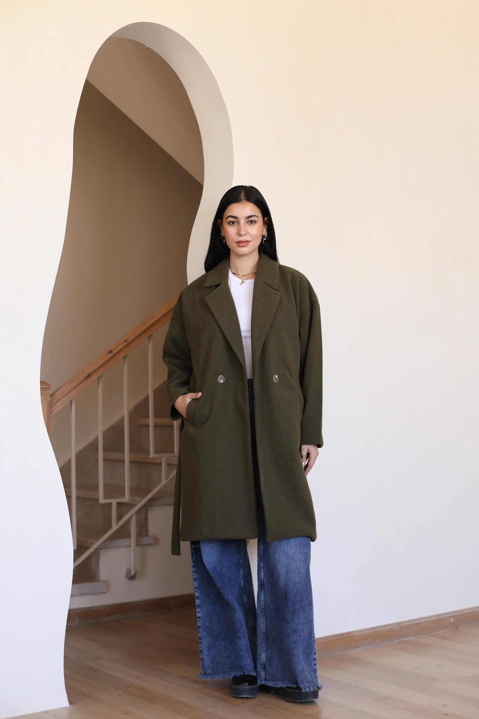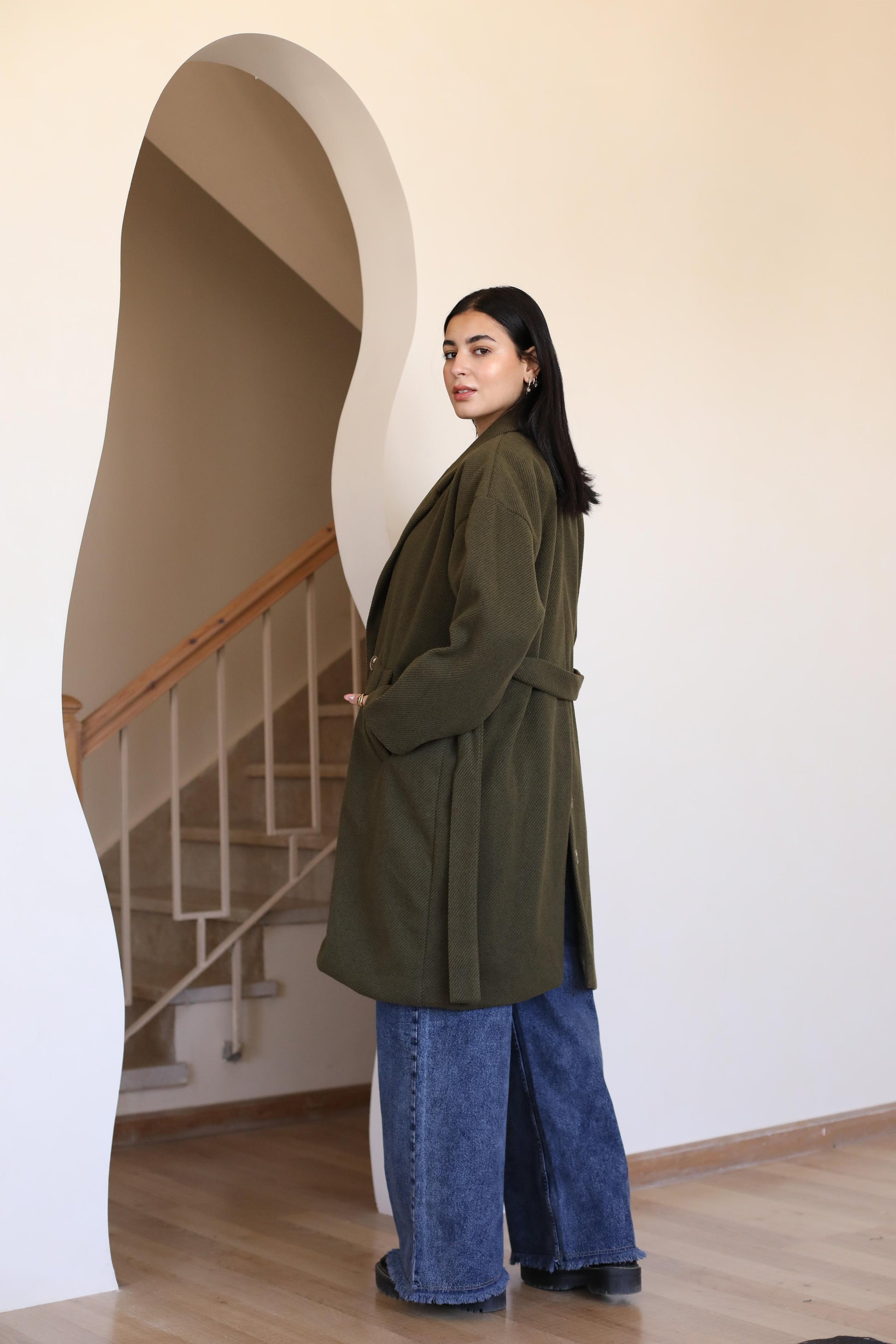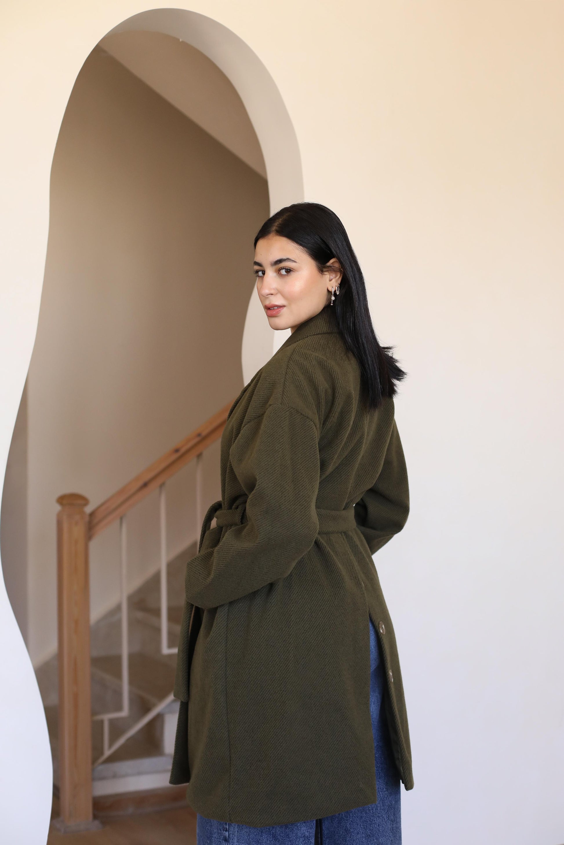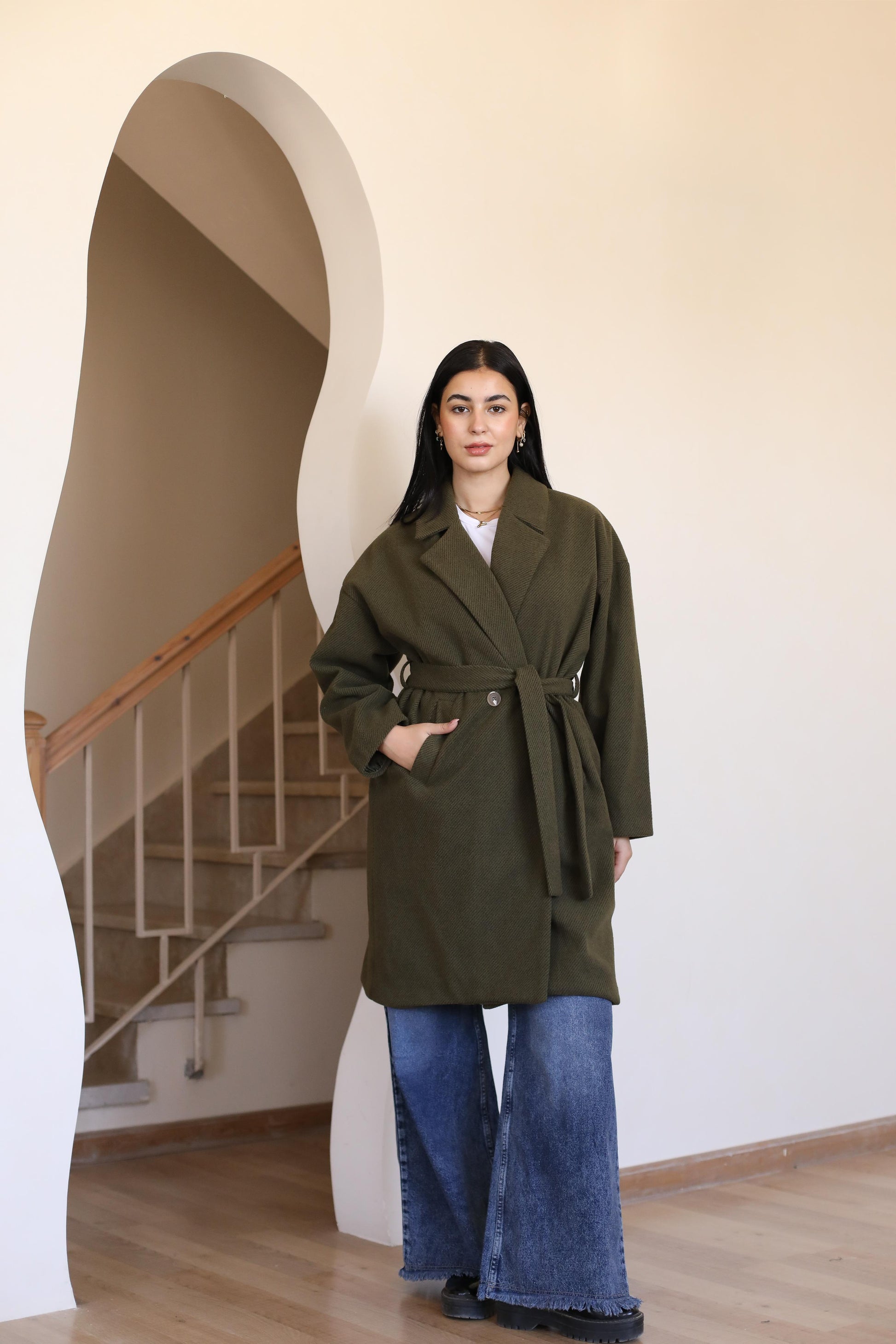 Long coat in woven fabric. Pointed lapels, bottoms at front, and welt side pockets. Wide, removable tie belt at waist, bottom at the back.