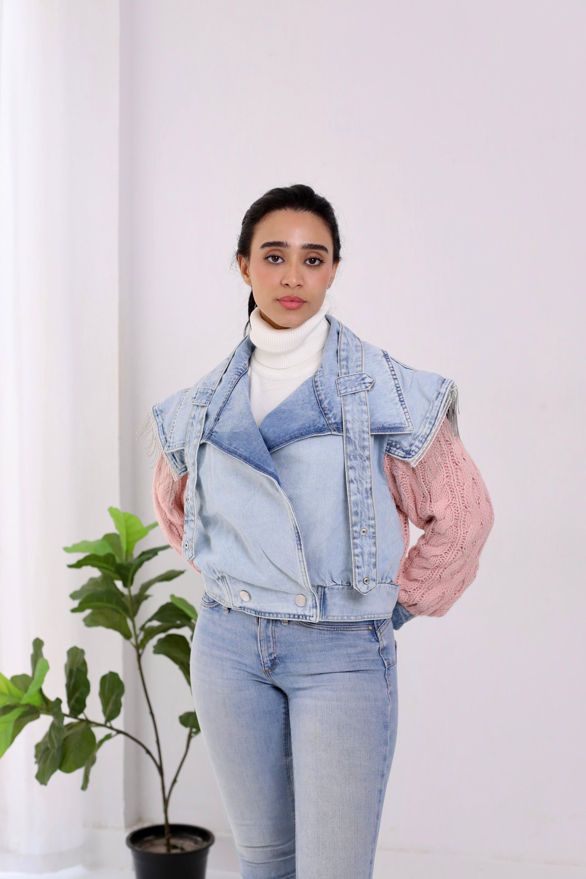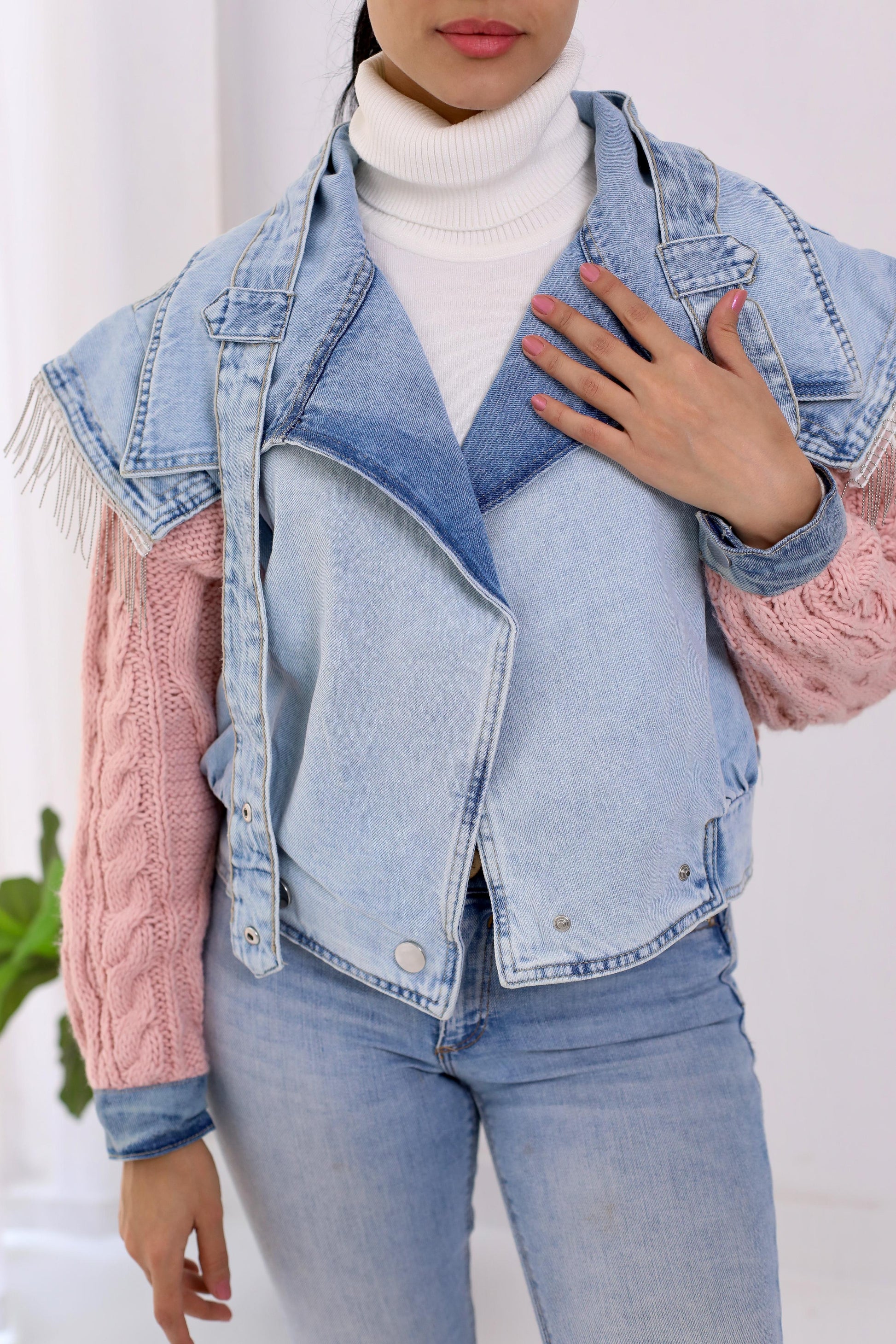Jeans jacket with Knitting sleeves and knitting back with accessories in the collar