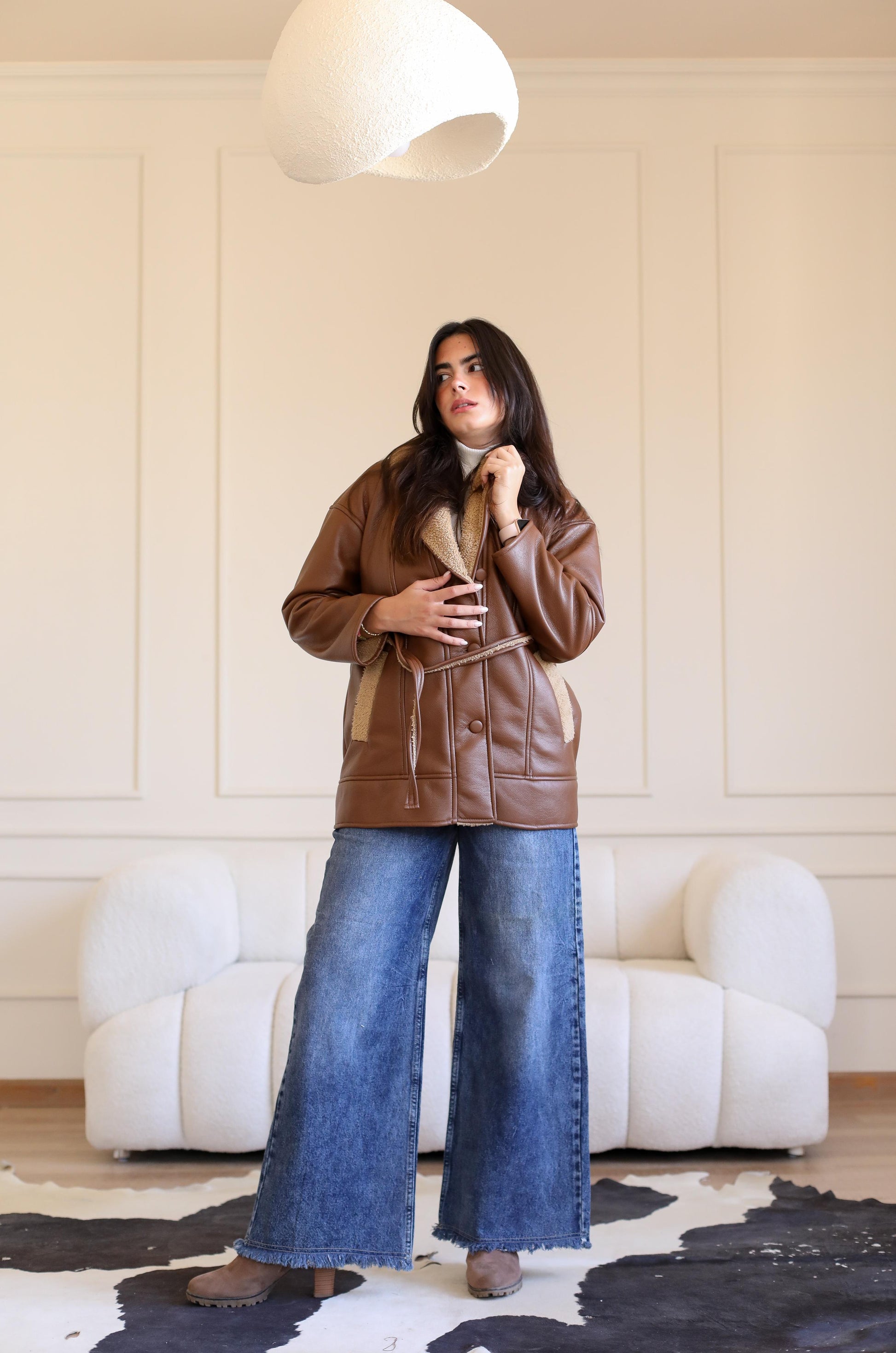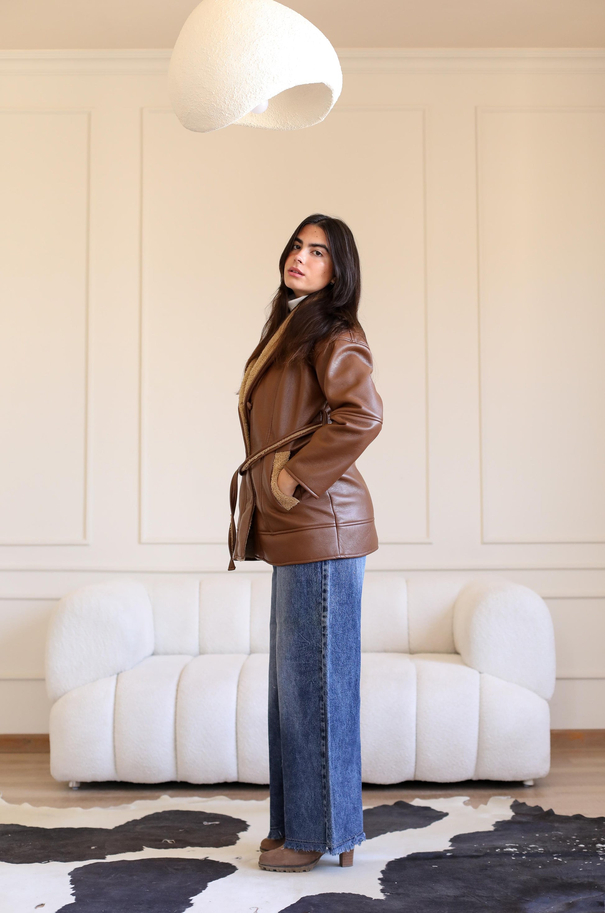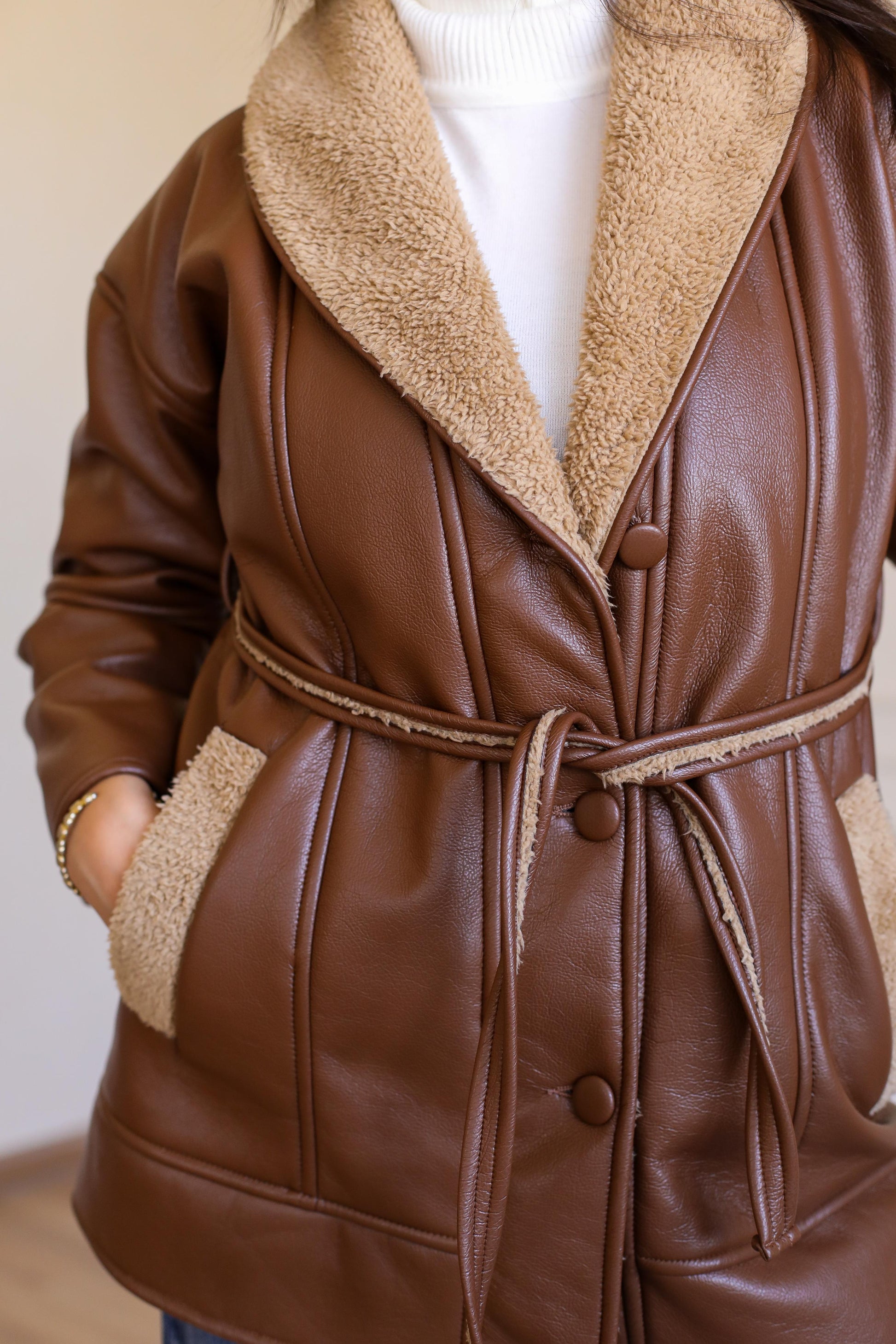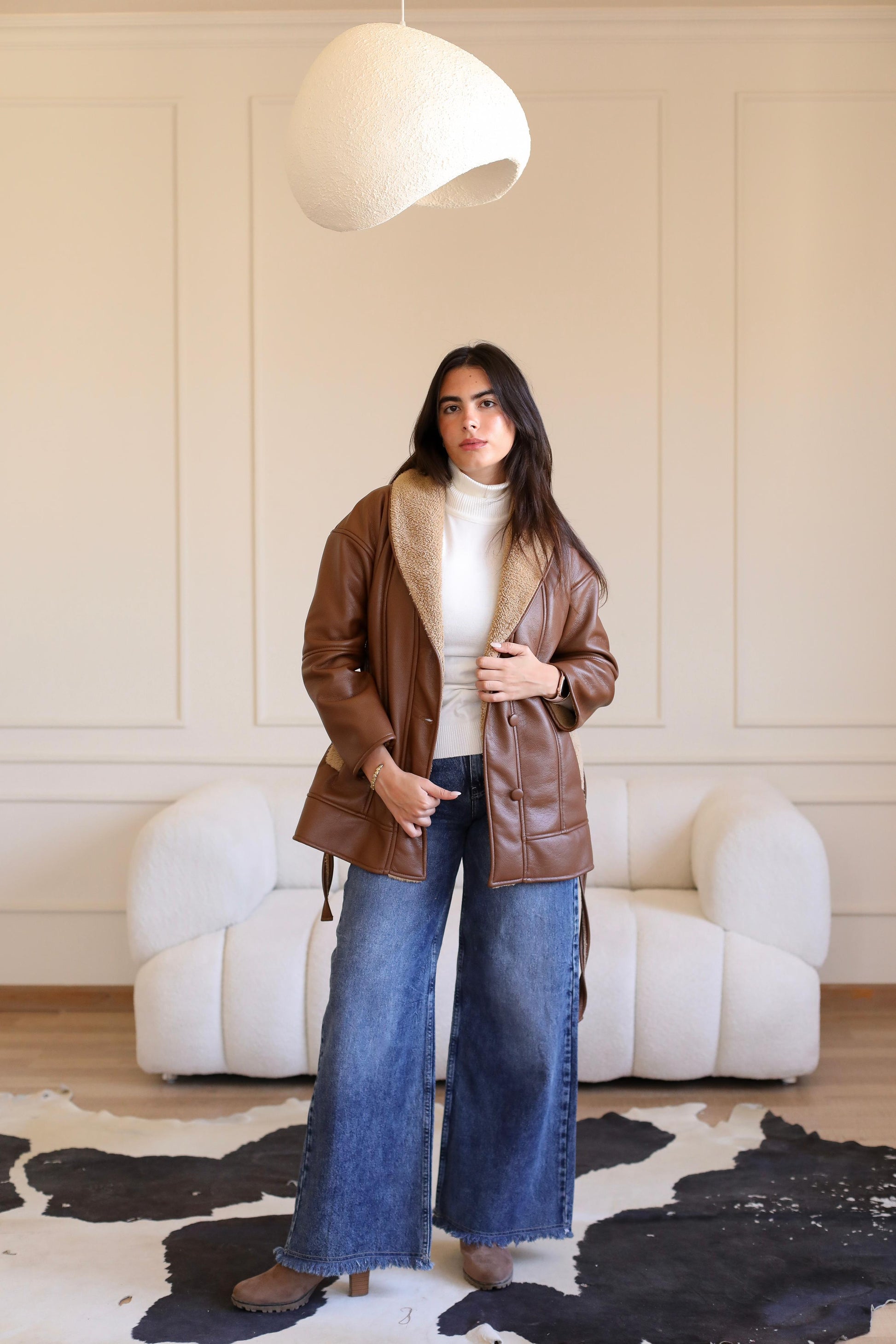 Leather jacket with lapel collar and long sleeves. Front pockets. Combination fleece fabric lining. Front button closure.