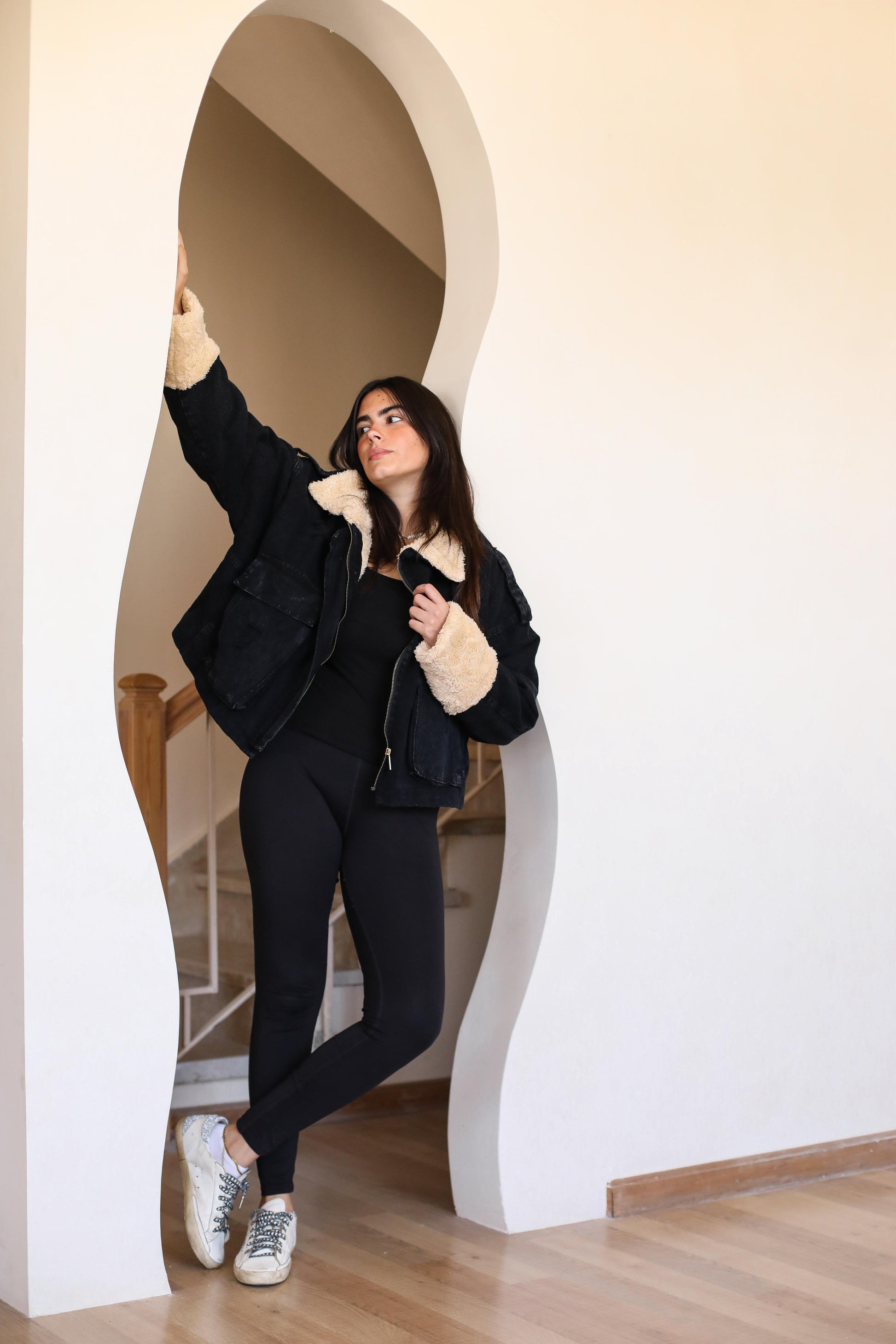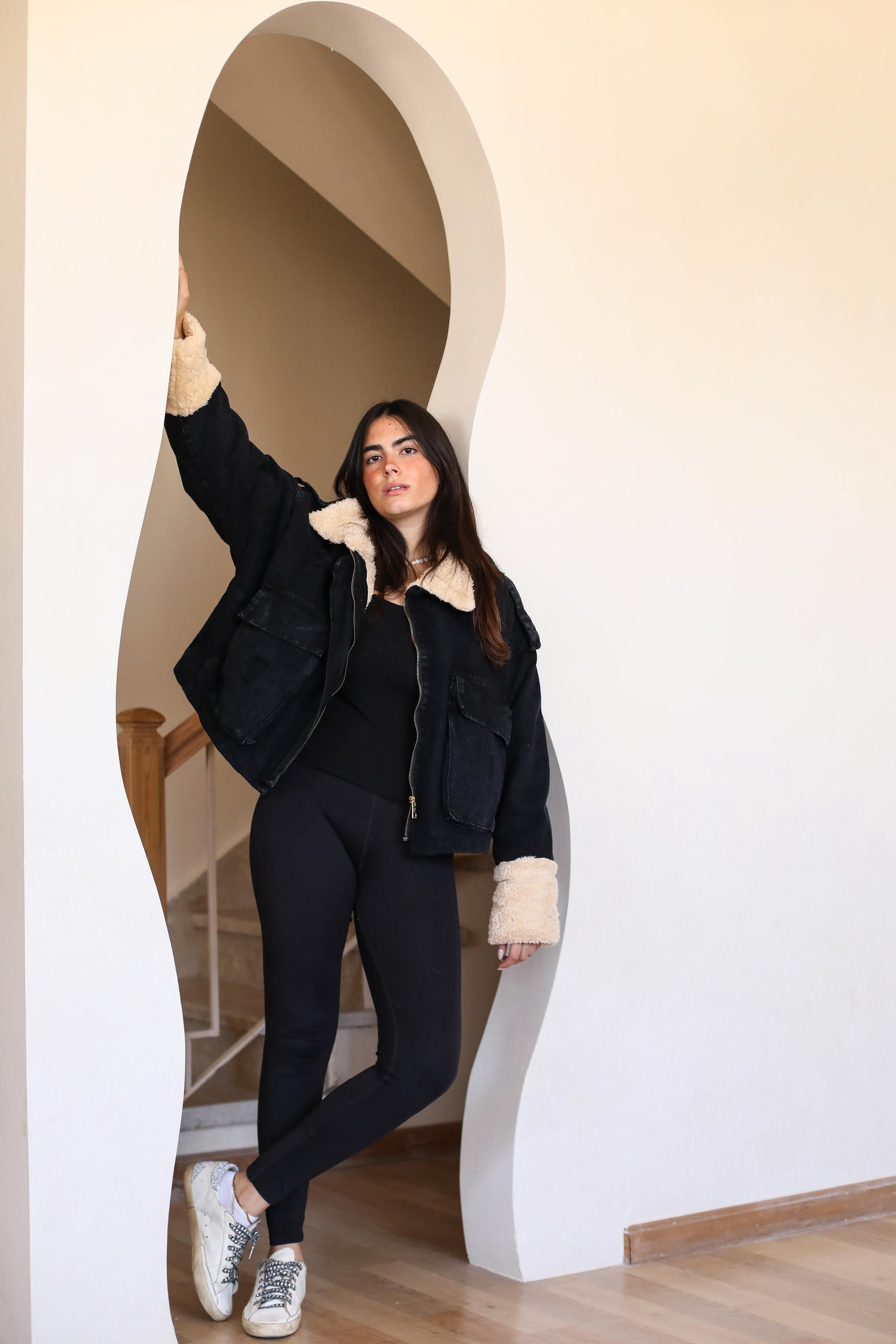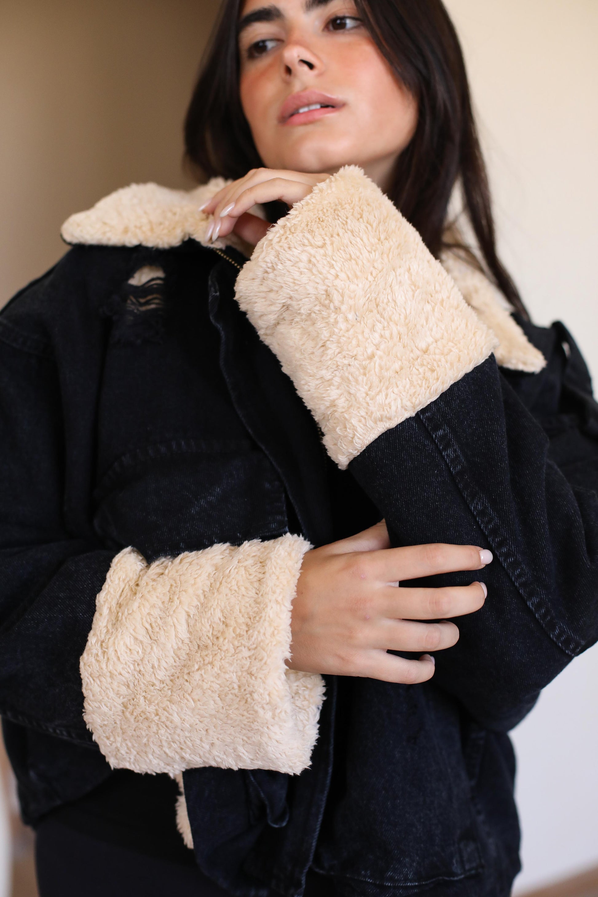 at front, chest pockets, and welt side pockets. Long sleeves, padded fur.