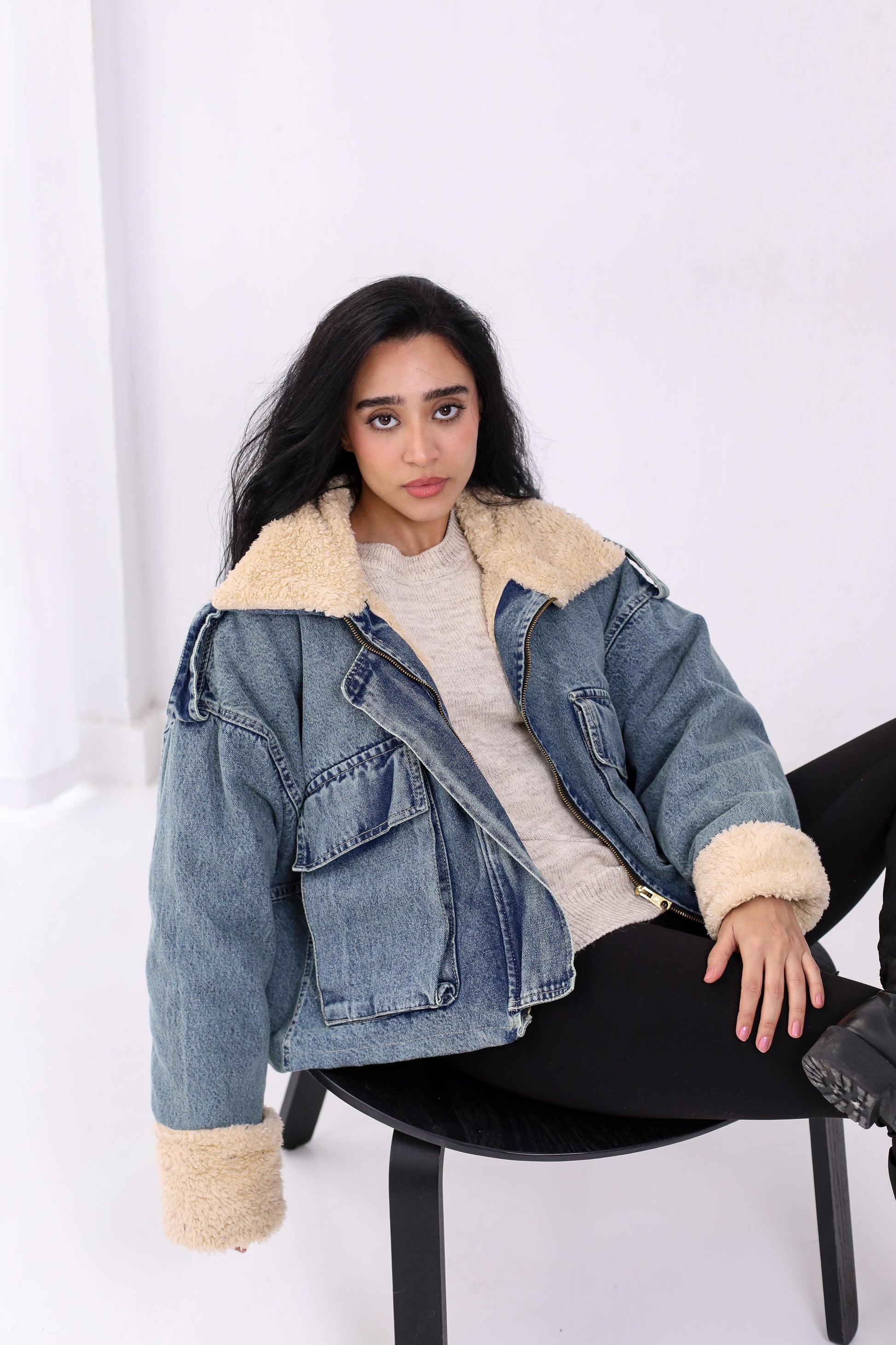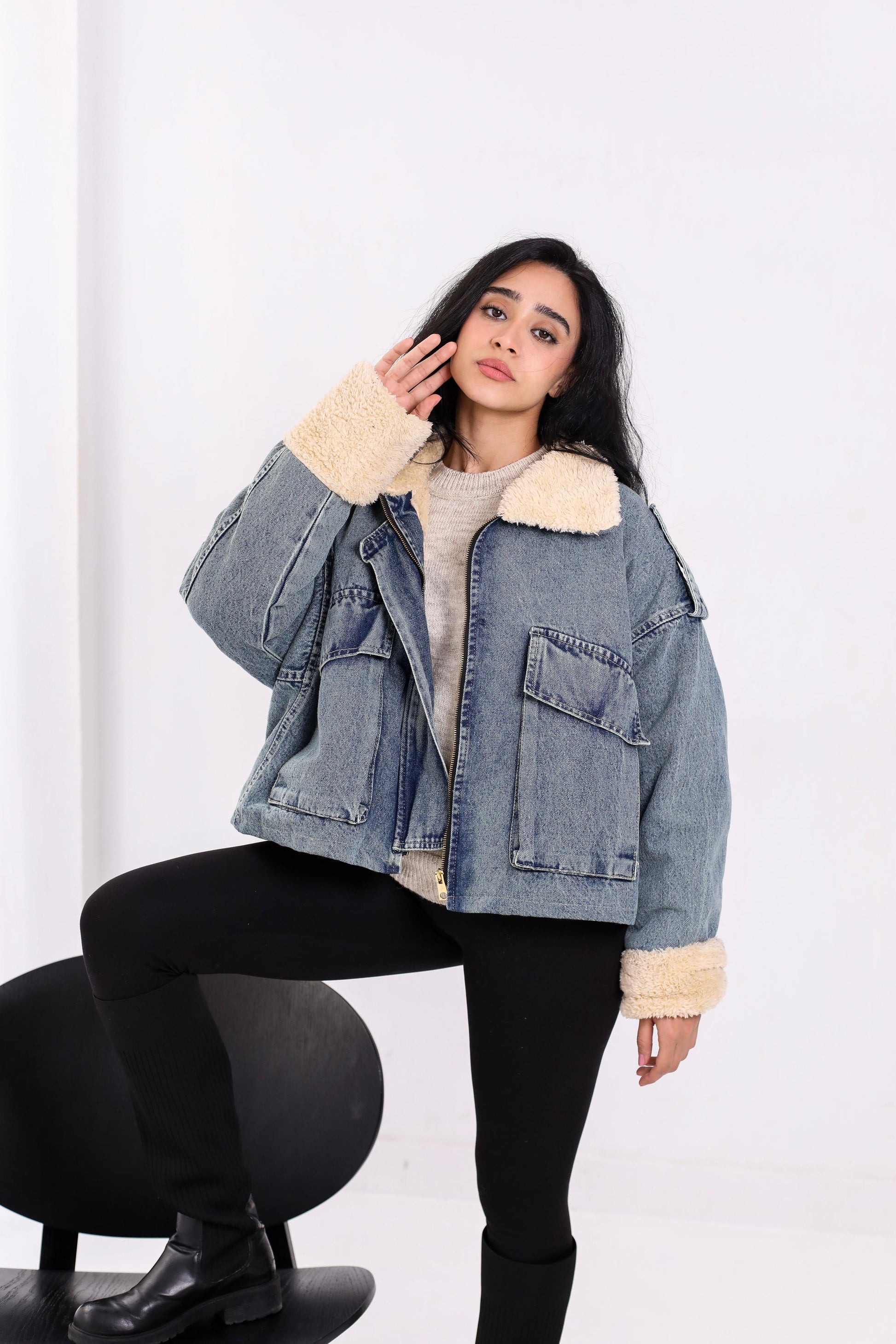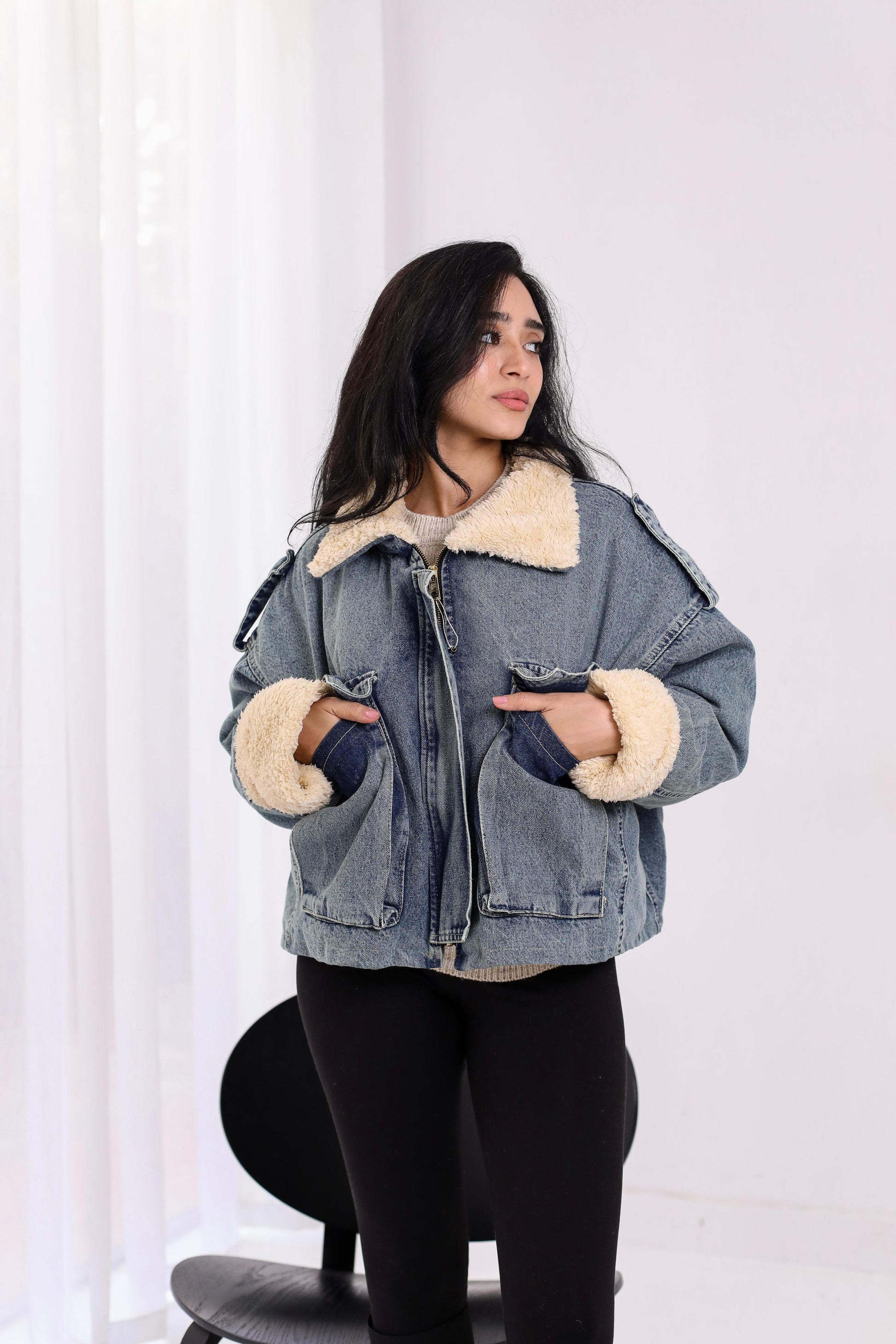 Oversize-fit denim jacket in non-stretch denim. Collar, metal zipper