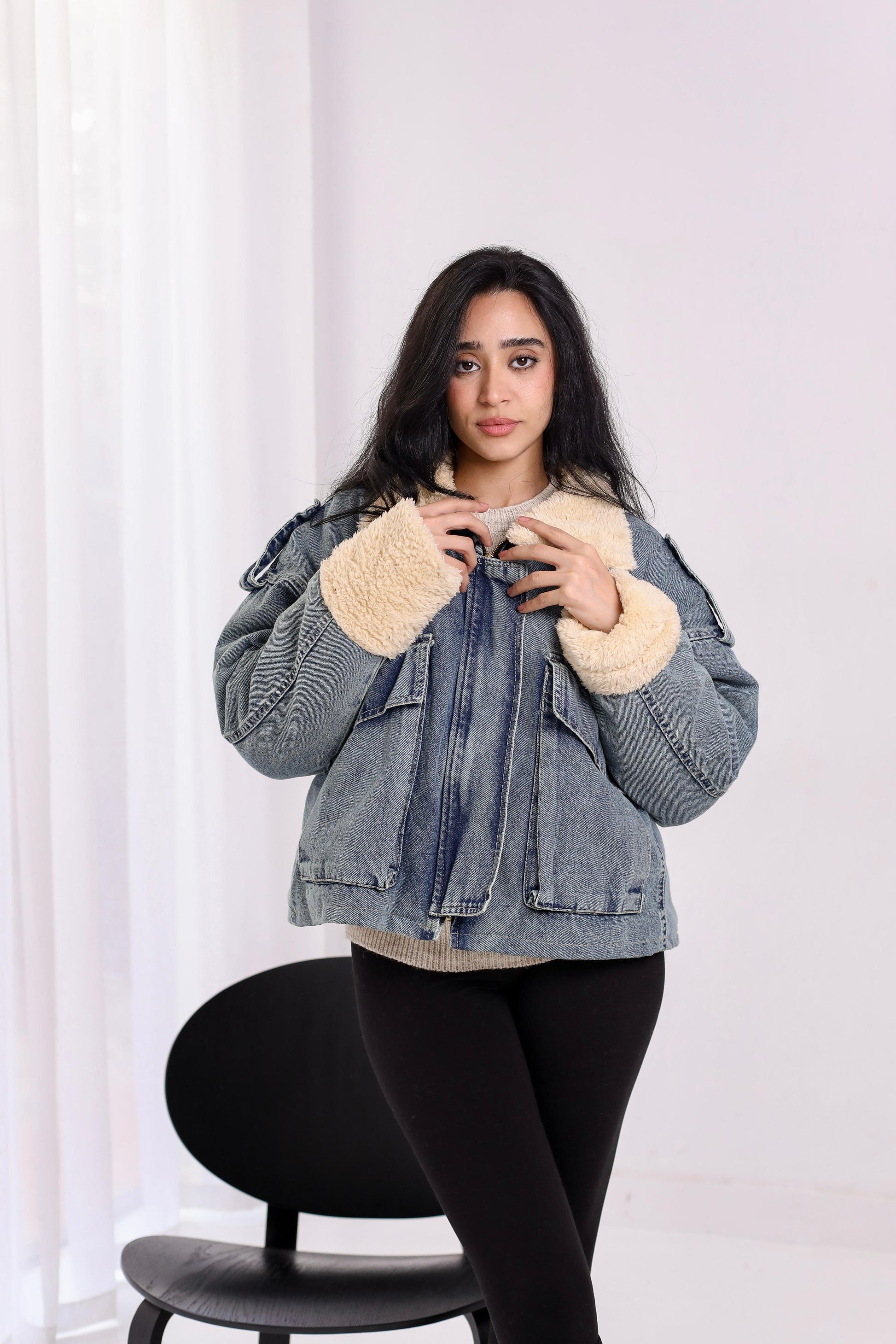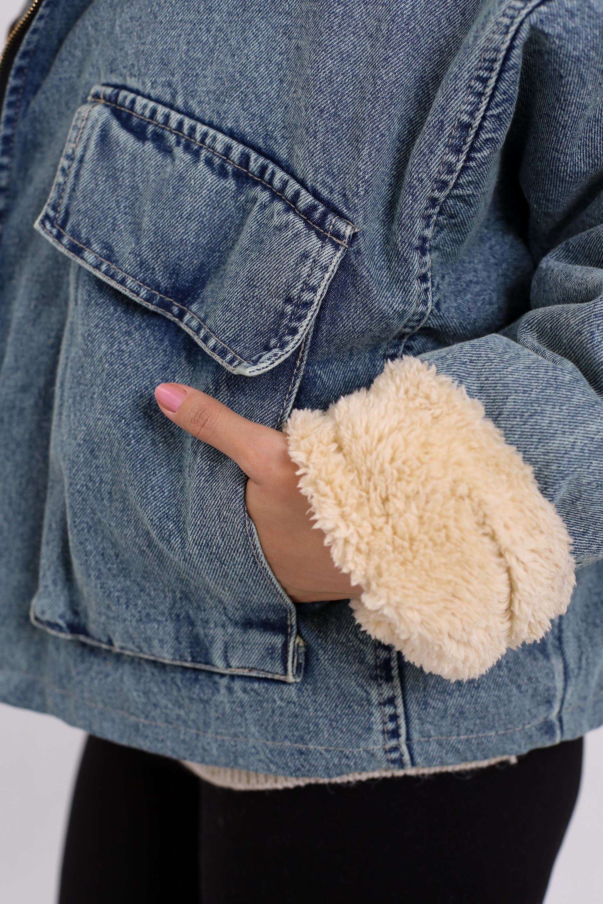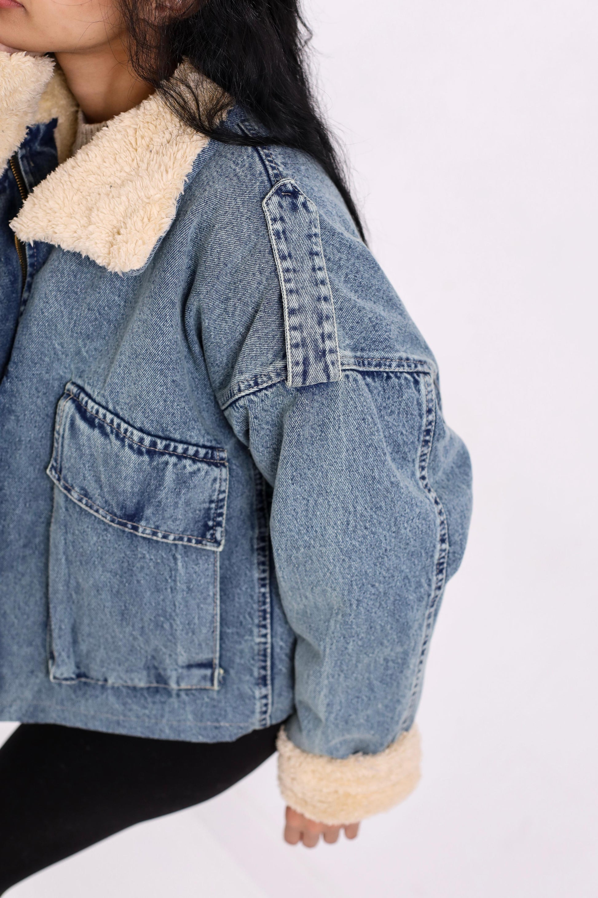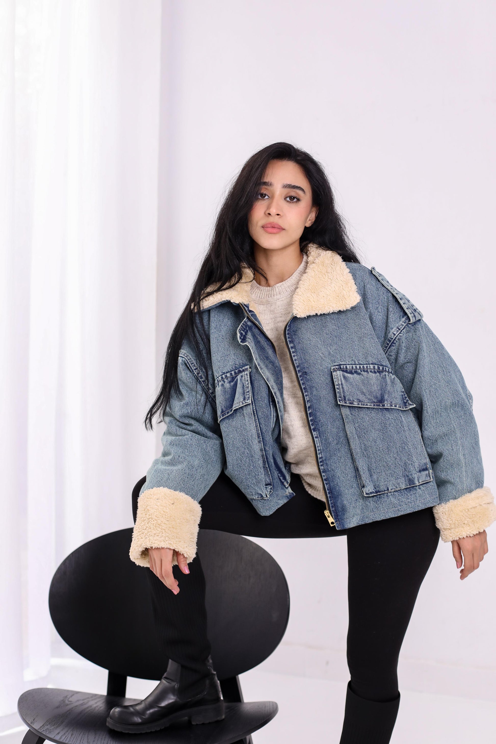 Oversize-fit denim jacket in non-stretch denim. Collar, metal zipper