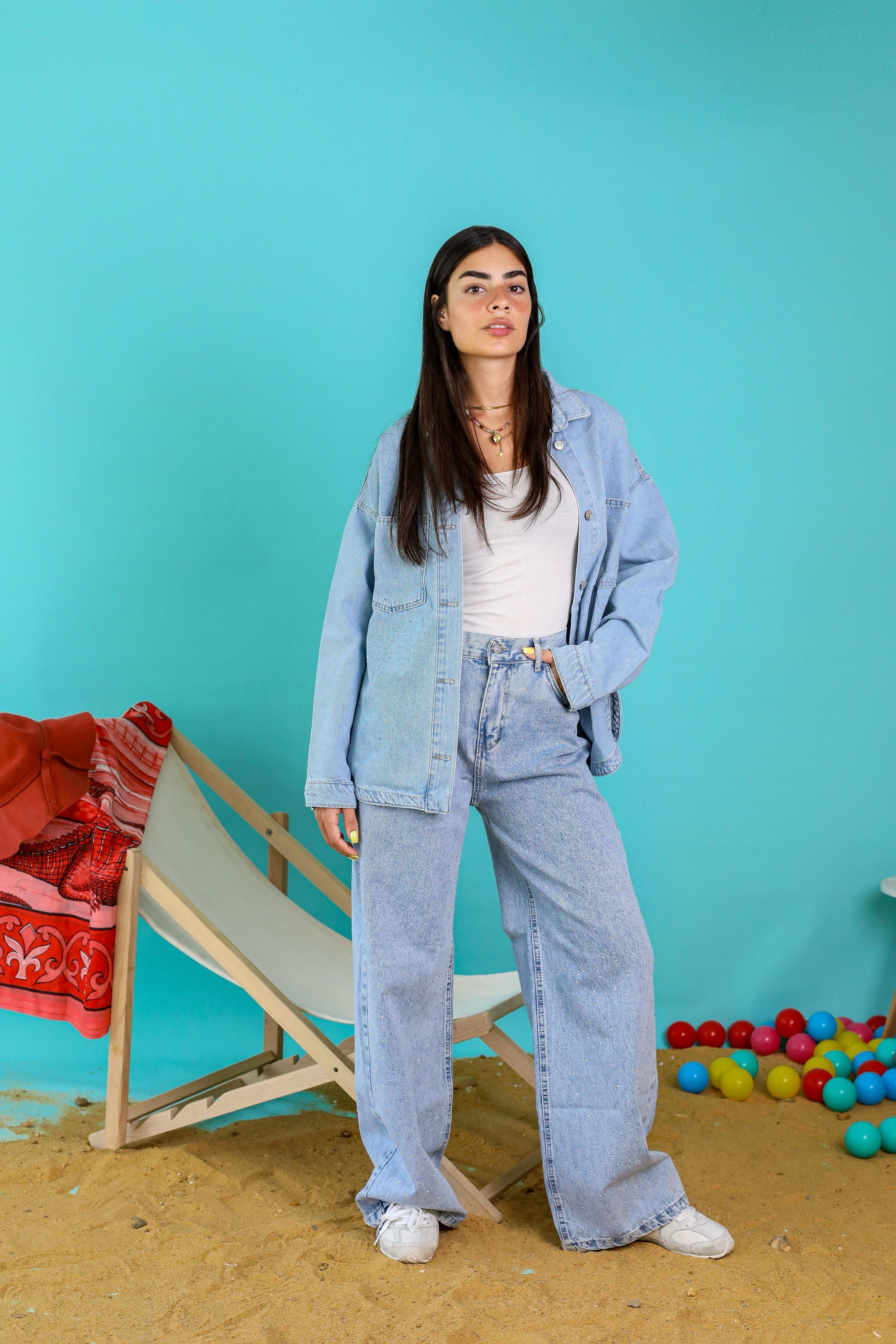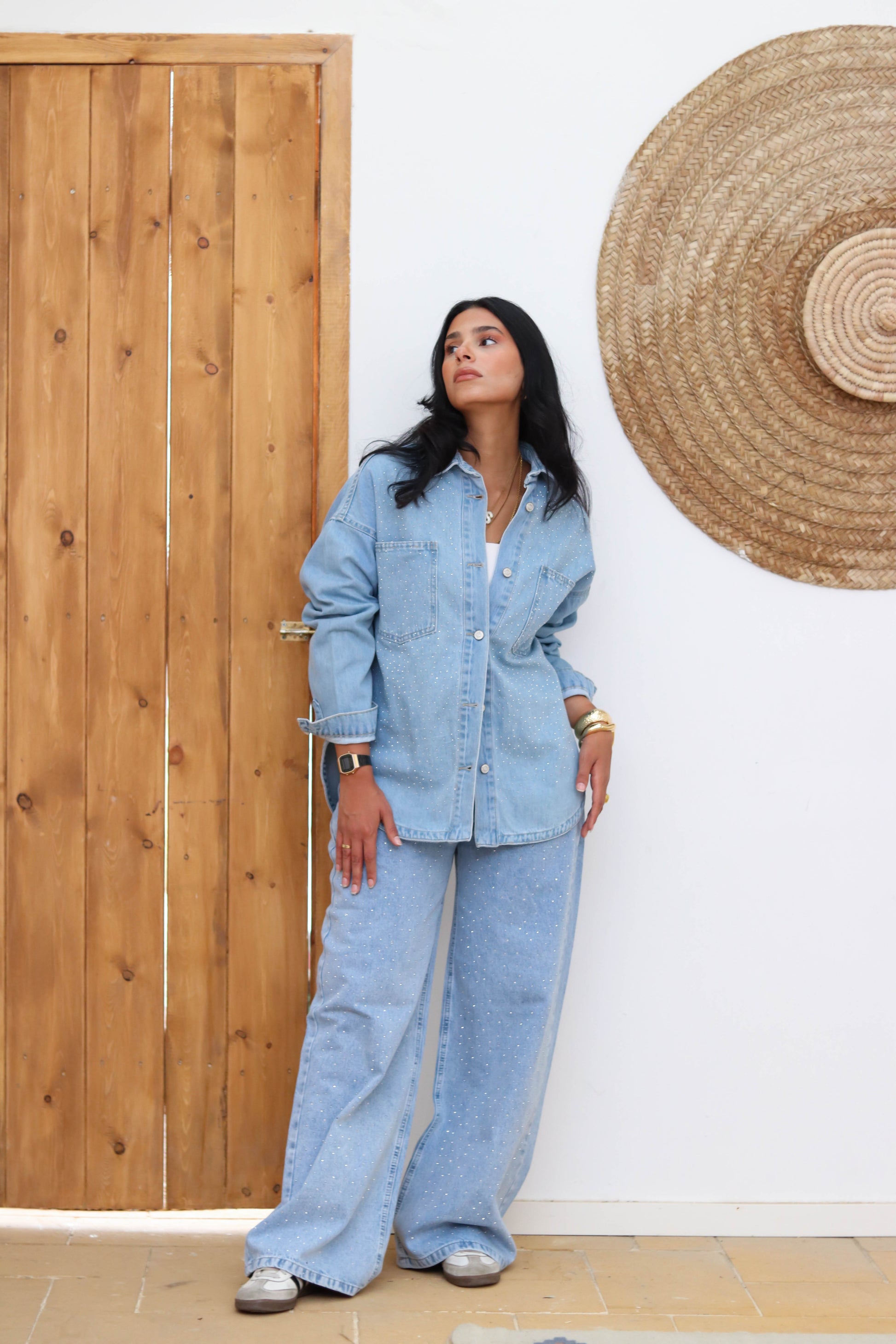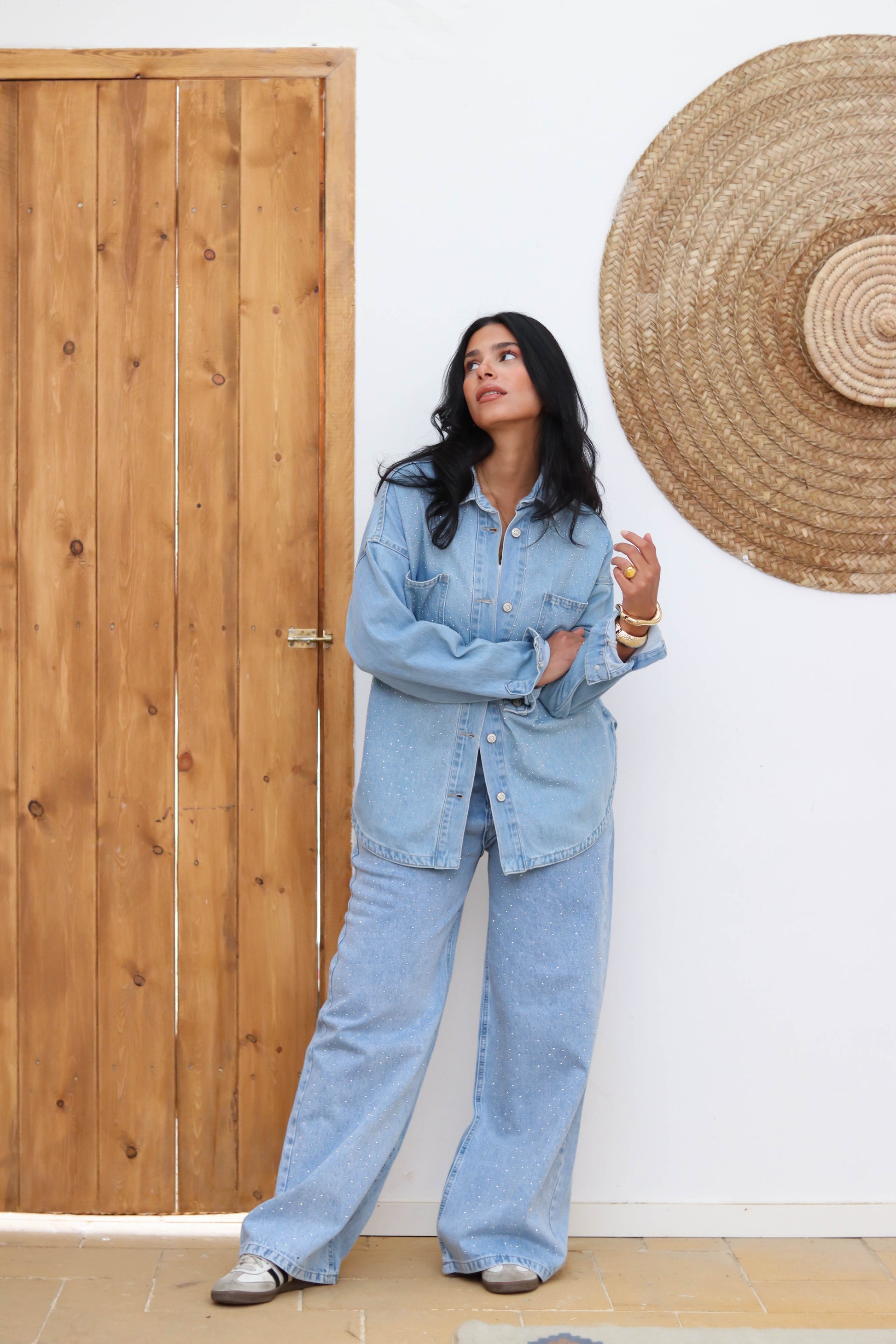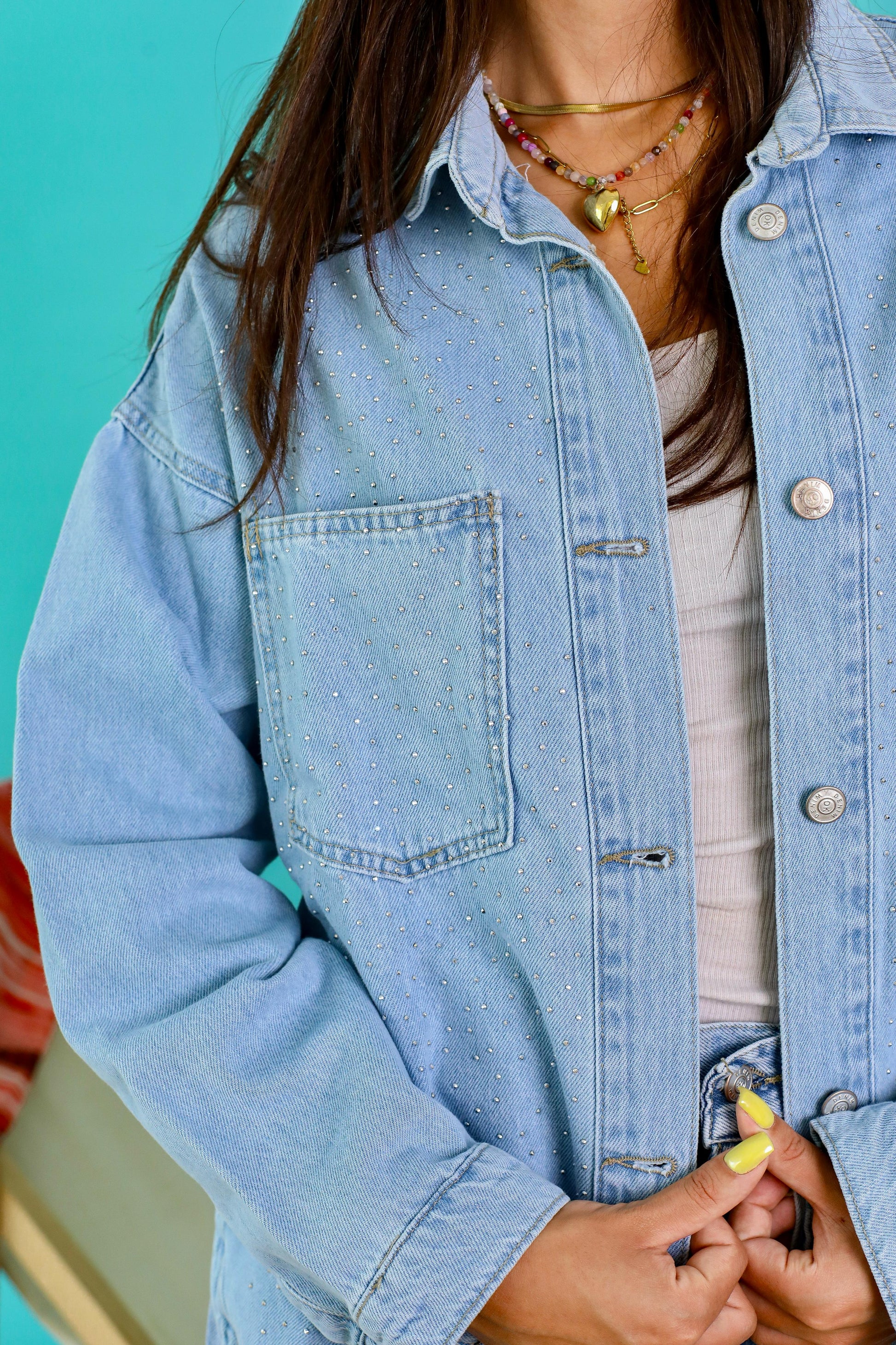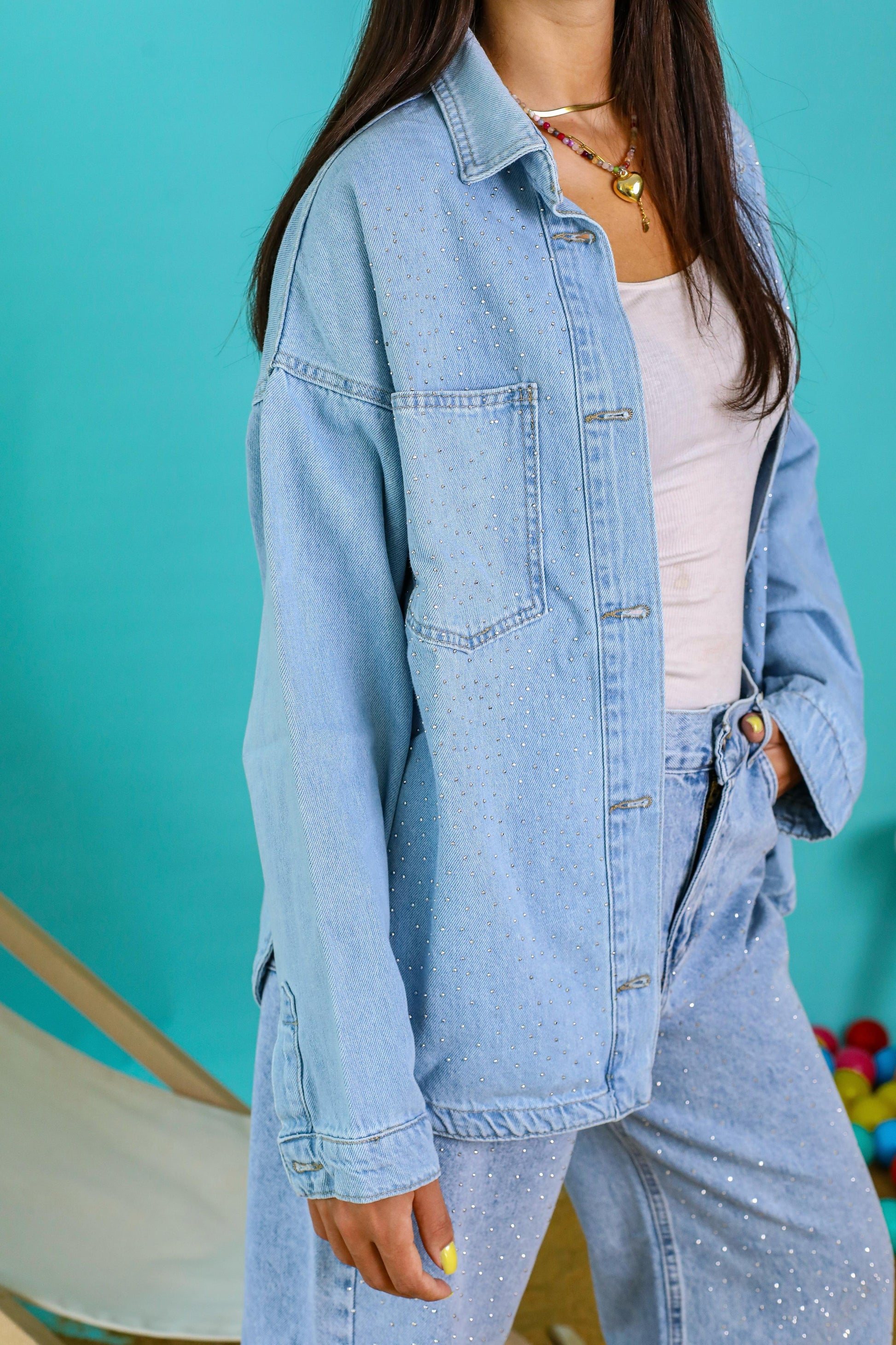 Add a hint of sparkle to your layers with the Twinkle Denim Jacket. Designed with a classic relaxed fit and scattered with subtle rhinestone embellishments, this jacket brings effortless glamour to your casual outfits.