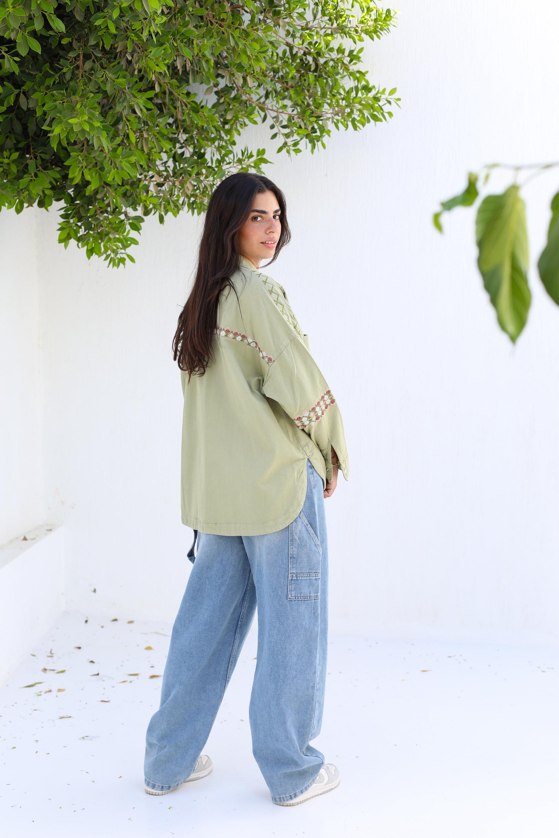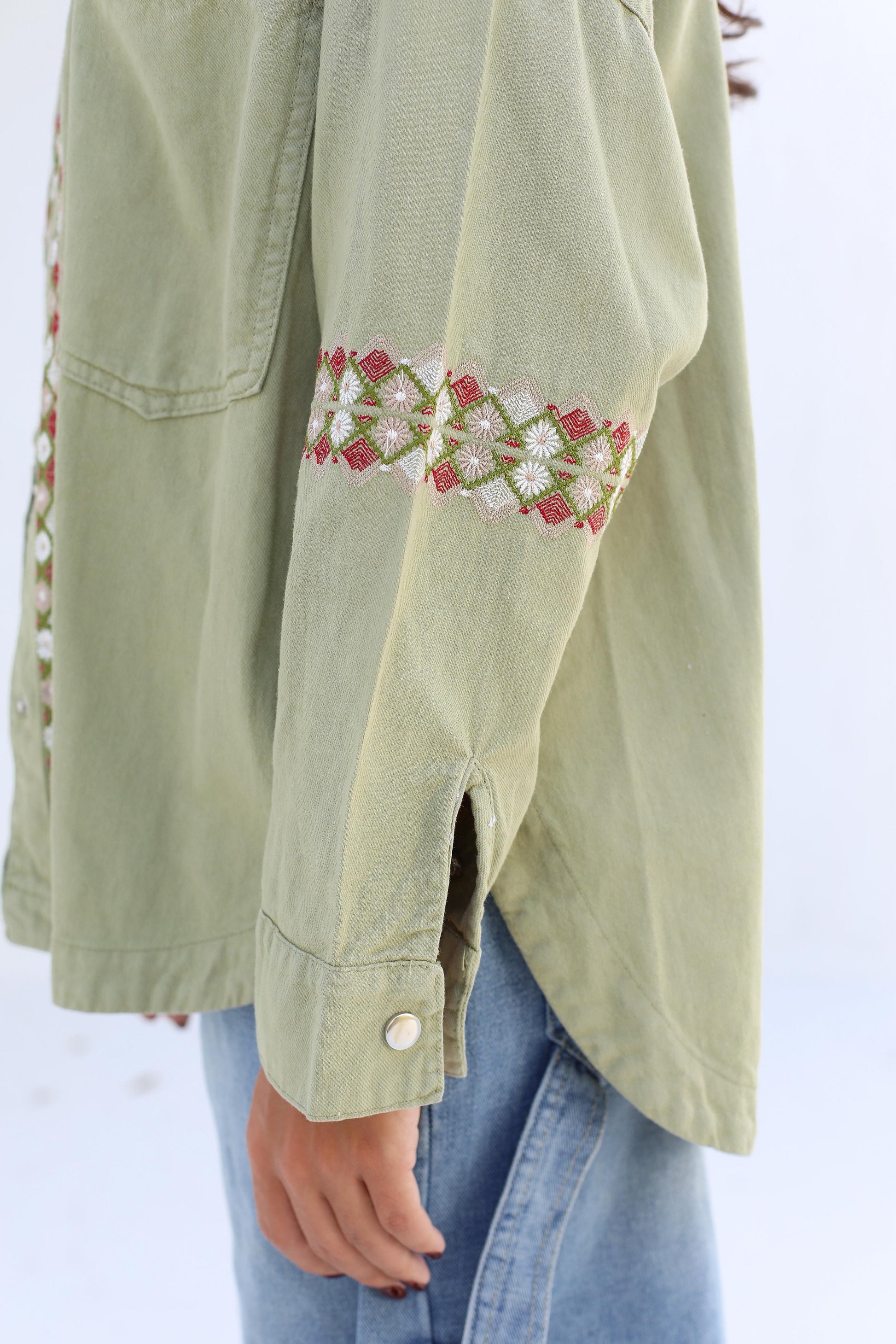 Crafted from high-quality cotton denim and delicately embroidered with hand-detailed motifs, this overshirt blends comfort with character. The soft, breathable fabric makes it a perfect layering piece for all seasons — whether you style it buttoned up, open over a tank, or paired with your favorite jeans.