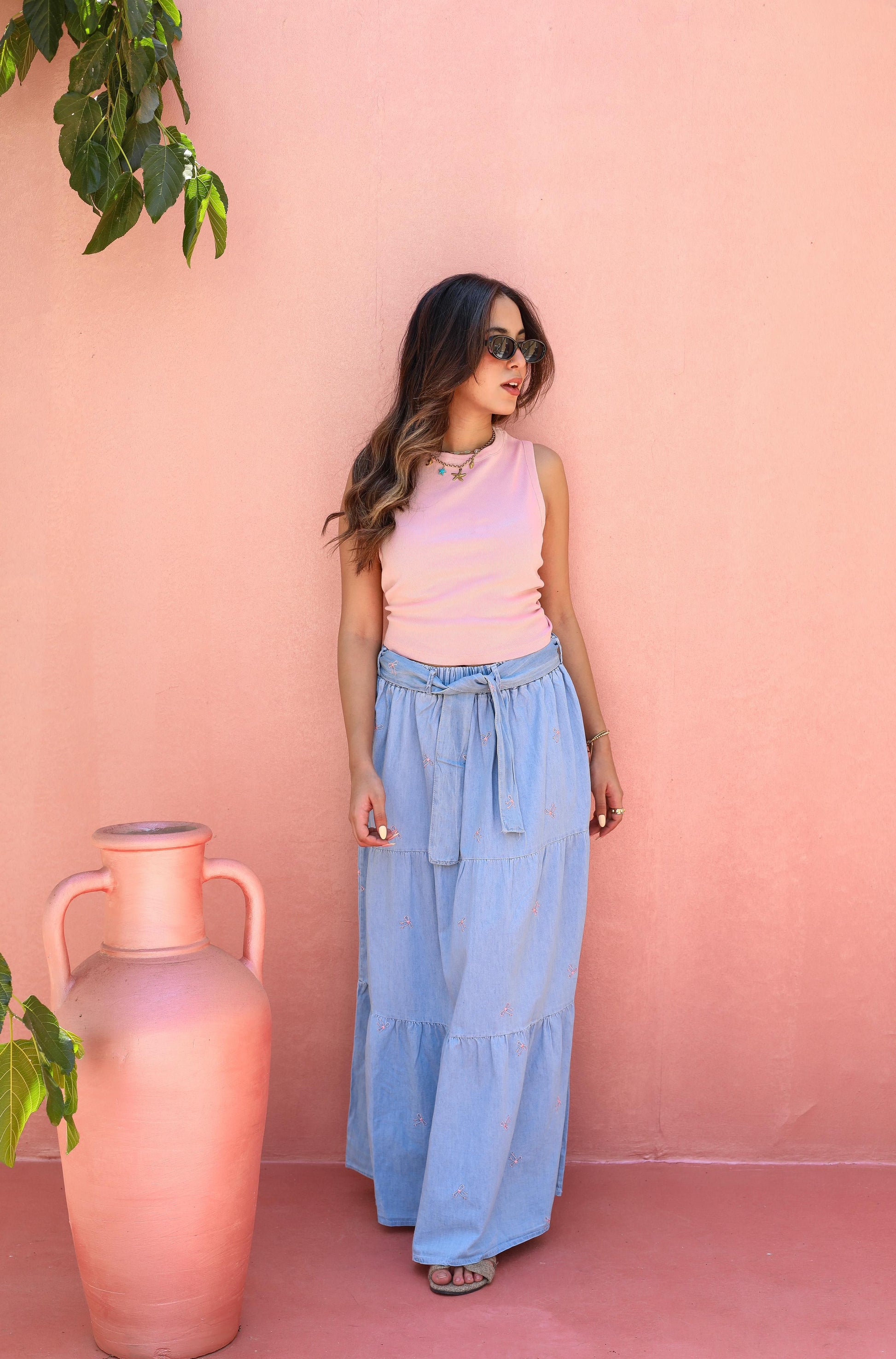 A lightweight denim maxi skirt with delicate embroidered bows throughout. Designed with a tiered silhouette and a soft tie at the waist, this piece brings a playful, romantic feel to your summer looks. The Bow Skirt flows effortlessly with every step(choose white bow or pink bow) — perfect for sunny strolls, picnics, or beachside cafés. Pair it with simple tanks or tucked-in blouses for an effortlessly sweet outfit.